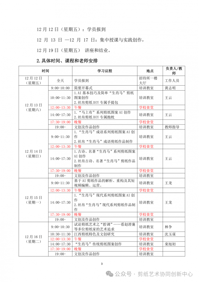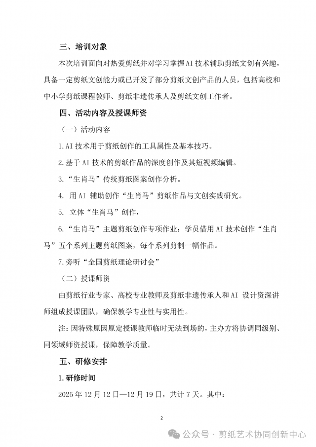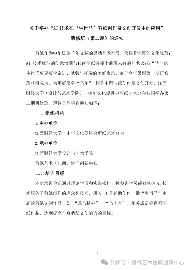 “AI技术在‘生肖马’剪纸创作及文创开发中的应用“(第二期)(原通知详见文后链接)因特殊情况没有如期举办,经剪纸艺术协同创新中心研究决定转为“AI技术在剪纸创作及文创开发中的应用”线上研修班,组织机构、培训目标和培训对象不变,其他内容修改如下: