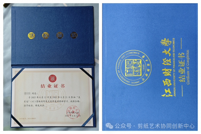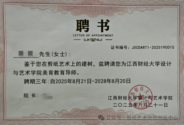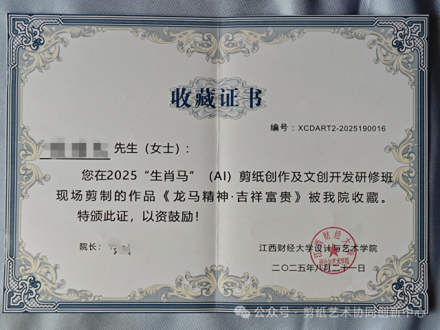 (2)前五年每年提交一幅用AI生成的图案创作剪纸作品(要求自己卷轴装裱),在江西财经大学中华剪纸艺术博物馆展出,并由江西财经大学设计与艺术学院联合颁发收藏证书;
